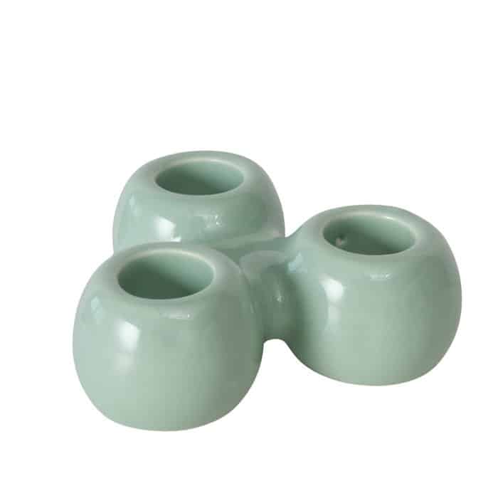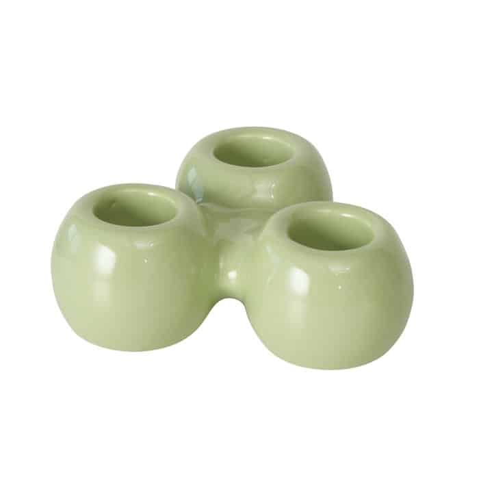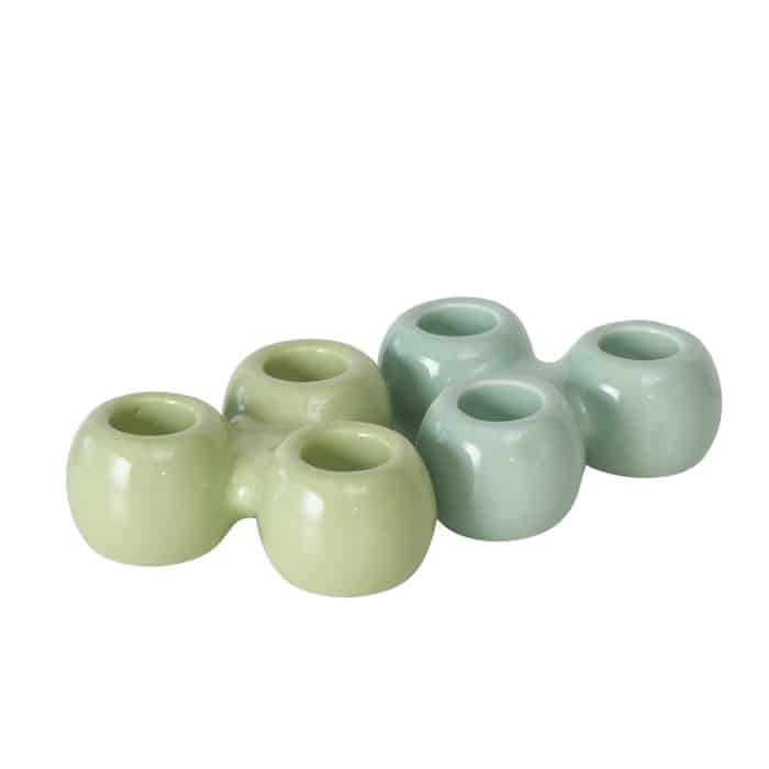 Een kaarsenhouder past in elk seizoen. Zo ook deze leuke en een tikkeltje eigenwijze set van 2 keramieken kaarsenhouders in groentinten.