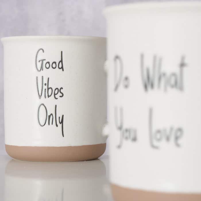 Deze set van 2 gave mokken zijn van keramike en zijn voorzien van een mooie tekst. Do what you love en Good vibes Only. Heerlijk positieve spreuken .