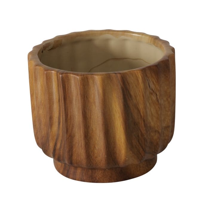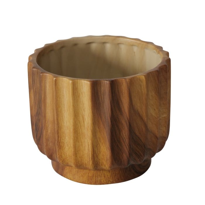 Hoewel ze eruitzien als echt hout, zijn de potten gemaakt van hoogwaardig keramiek, wat ze stevig, duurzaam én makkelijk schoon te maken maakt. De subtiele glans en het geribbelde design geven een luxe, natuurlijke uitstraling met een moderne vibe.