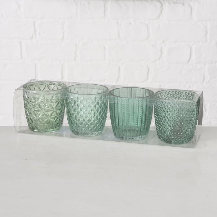 Breng sfeer in huis met deze prachtige set van 4 glazen waxinehouders van het trendy merk Boltze. De waxinelichthouders zijn uitgevoerd in verschillende structuren en tinten, waardoor ze samen een speels en stijlvol geheel vormen.