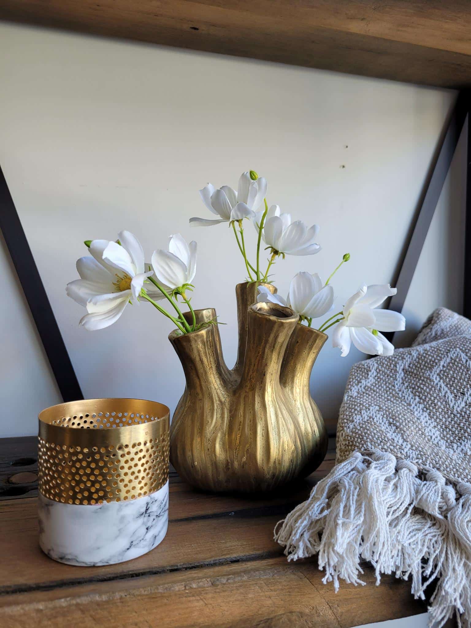 Deze gave Aglio Uienvaas in de trendy kleur Rustiek Goud uit de collectie van Daan Kromhout is 13 cm hoog en 16 cm breed. De 5 in hoogte verschillende halsjes maken het super fijn om bloemen in te schikken. Maar zelfs zonder bloemen of takken misstaat deze toffe eyecatcher niet in je interieur.