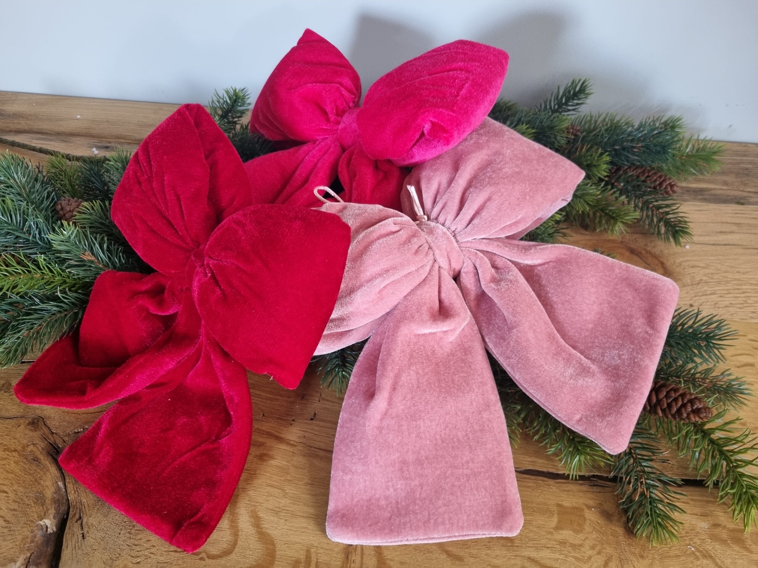 ✨ Creëer een feestelijke en luxe kerstsfeer met de set van 3 fluwelen decoratiestrikken in rood, oudroze en fuchsia – stijlvol, groot en veelzijdig!