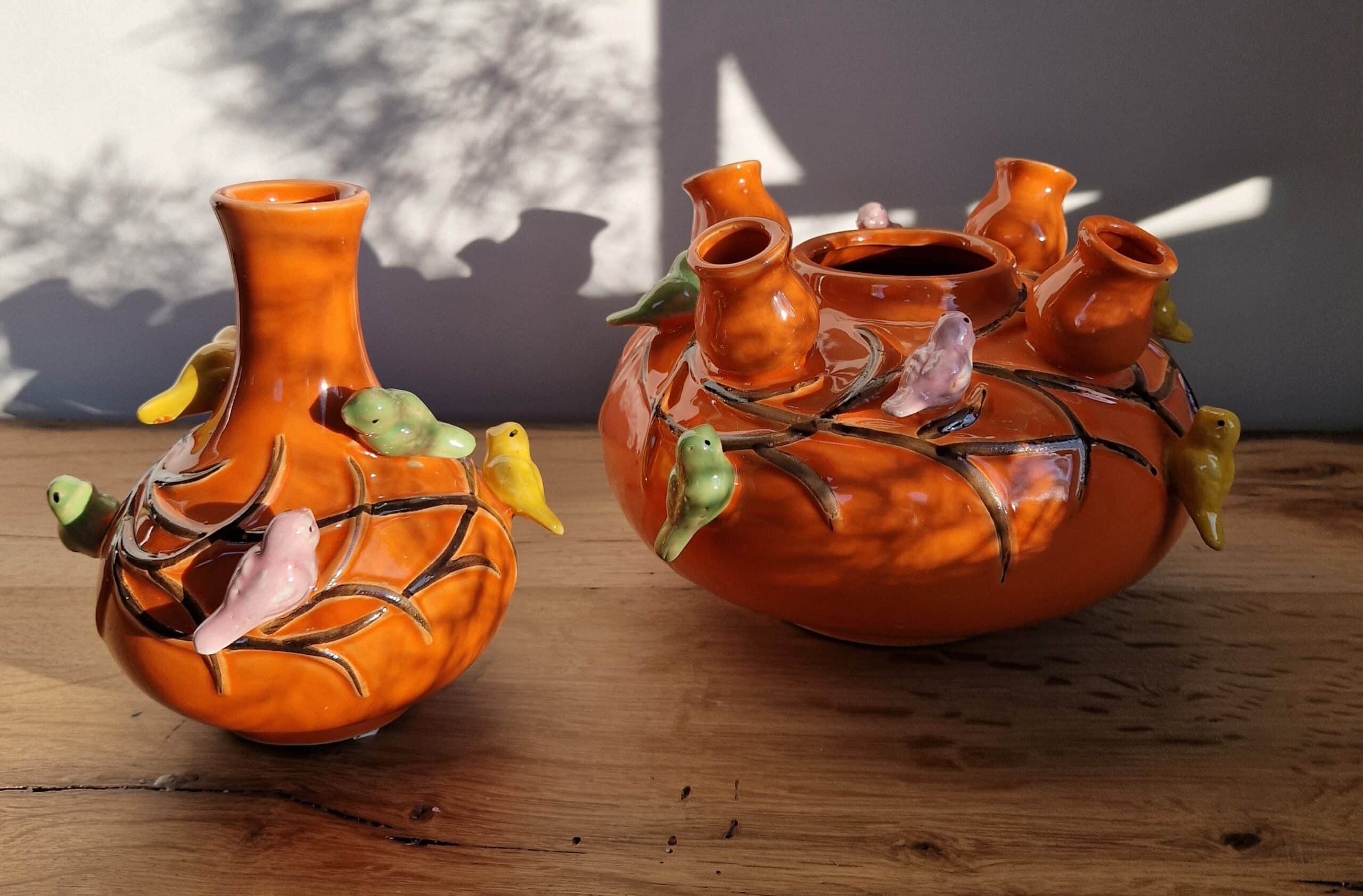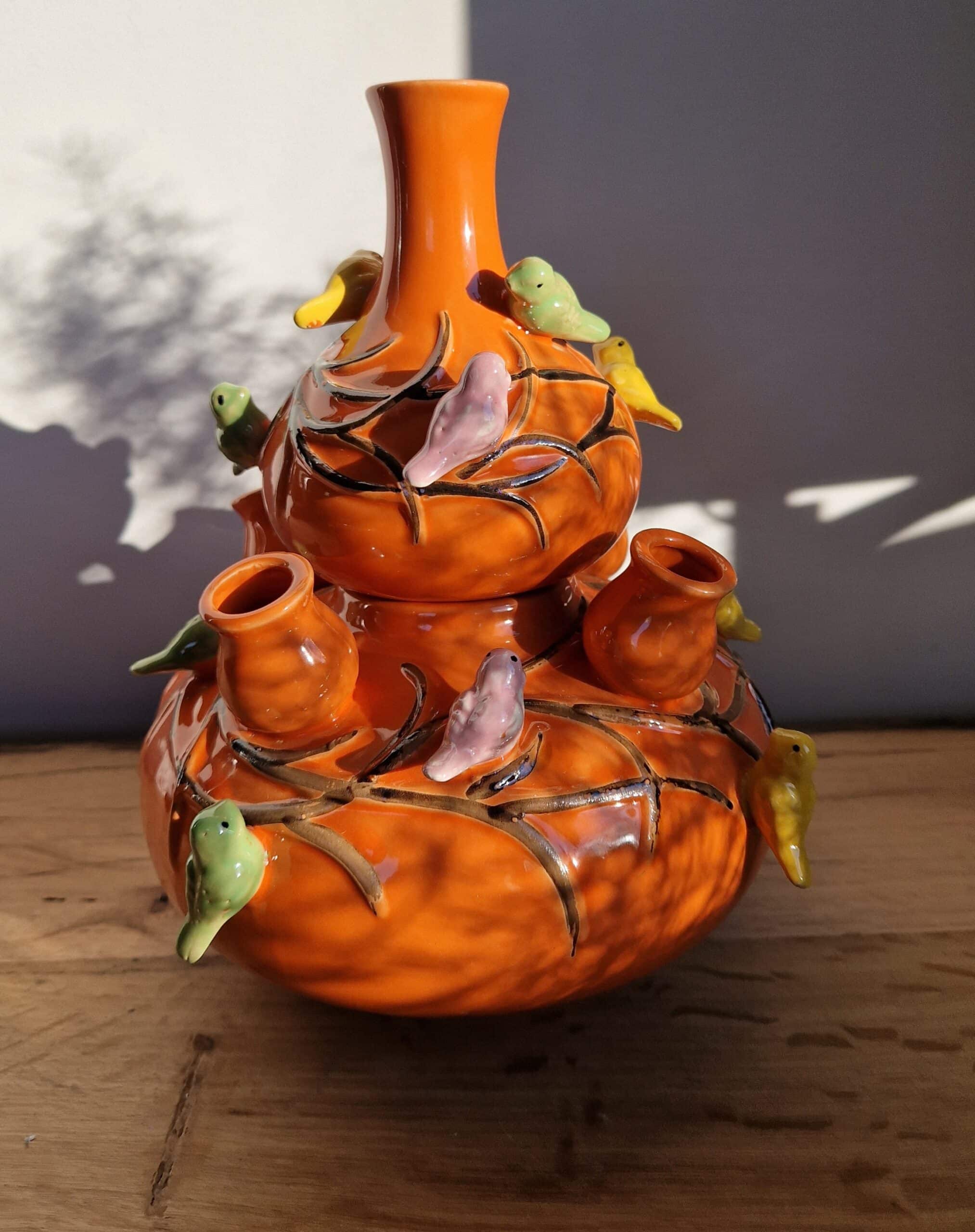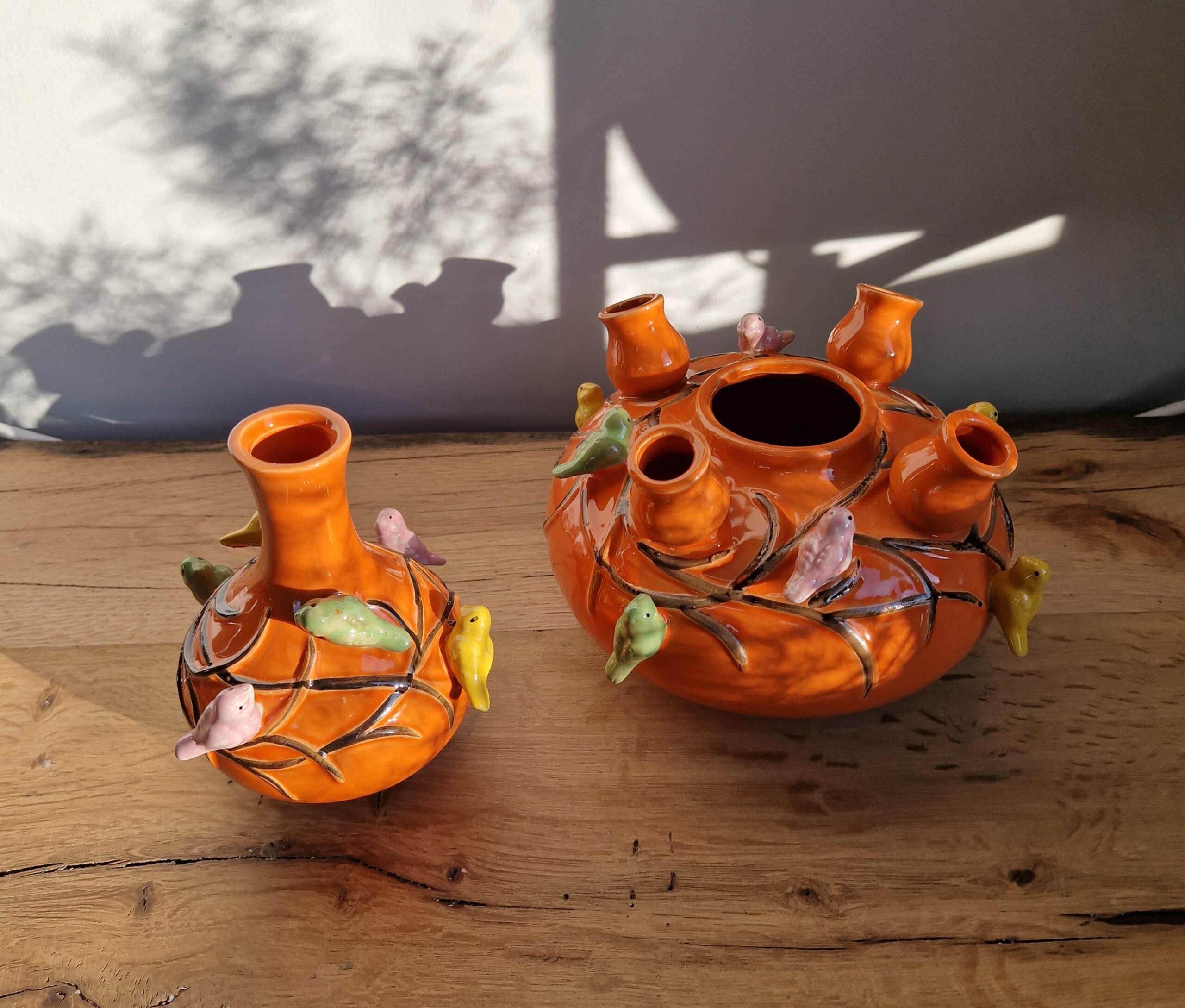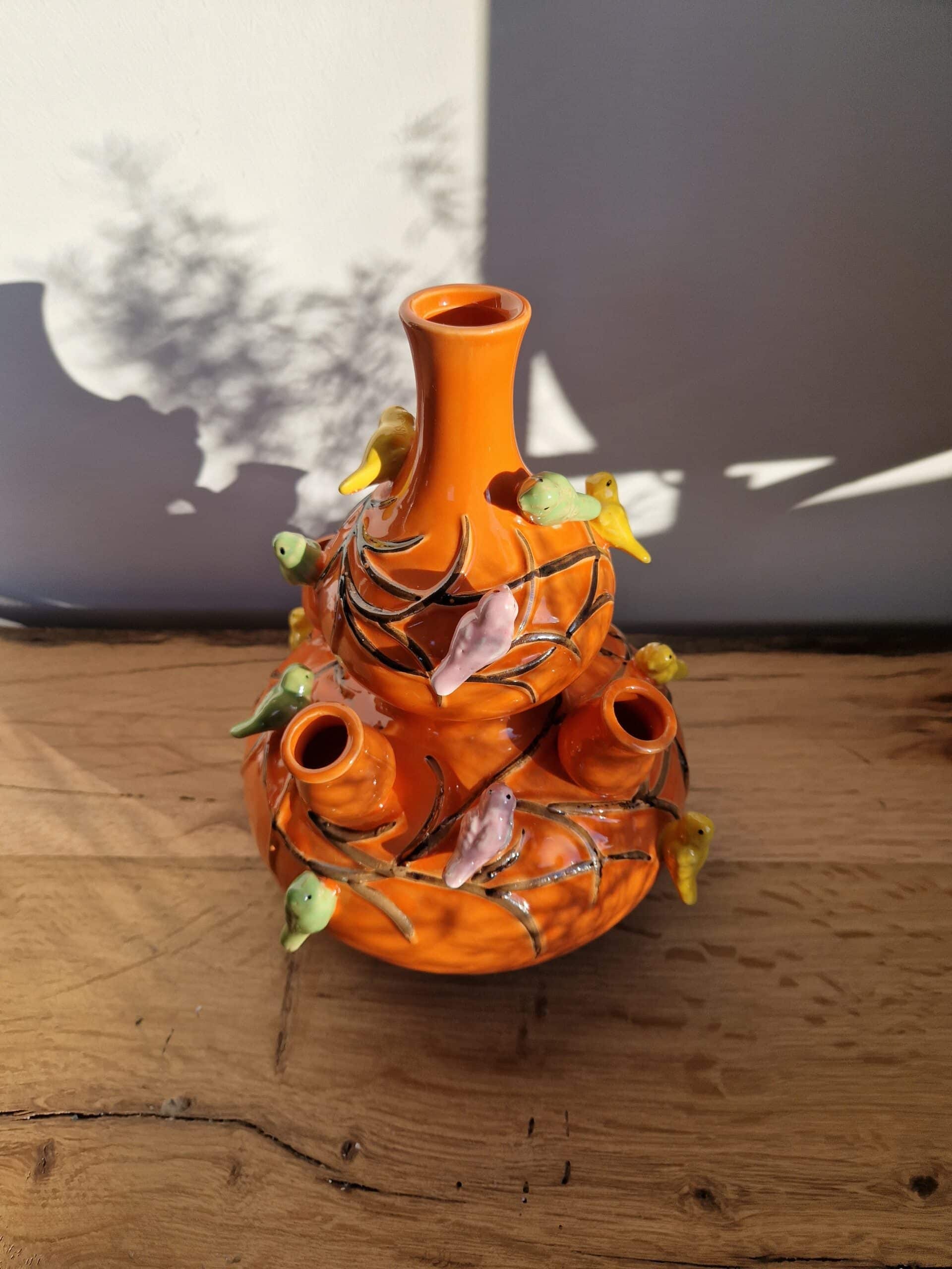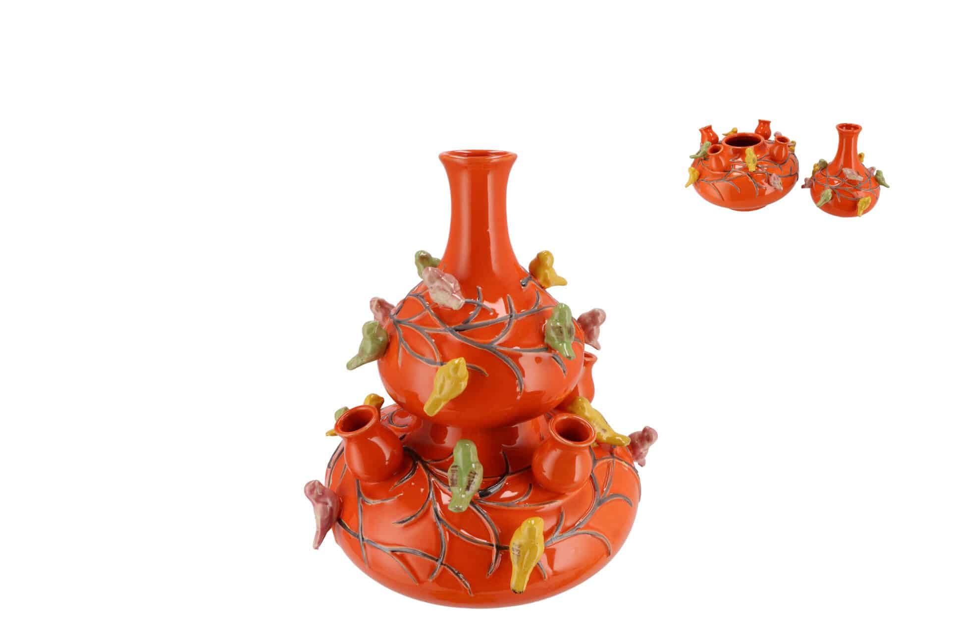 Deze gave Oranjekleurige vaas met opgebrachte handgemaakte vogeltjes in verschillende kleuren is 25 cm hoog en 23 cm breed. De vaass bestaat uit 2 delen, je kunt hem in zijn geheel gebruiken de twee delen naast elkaar zetten. De 5 halsjes maken het super fijn om bloemen in te schikken. Maar zelfs zonder bloemen of takken misstaat deze toffe eyecatcher niet in je interieur.