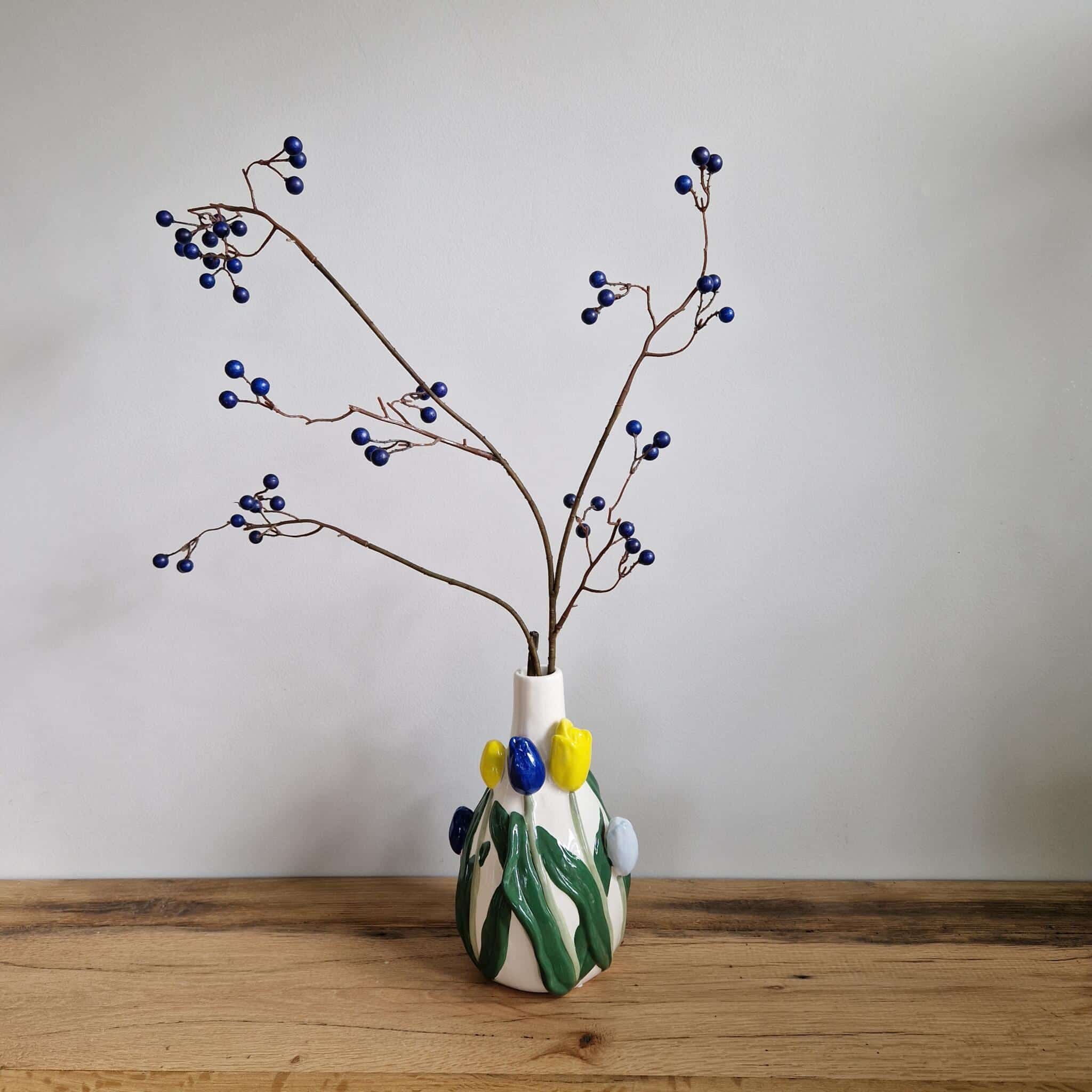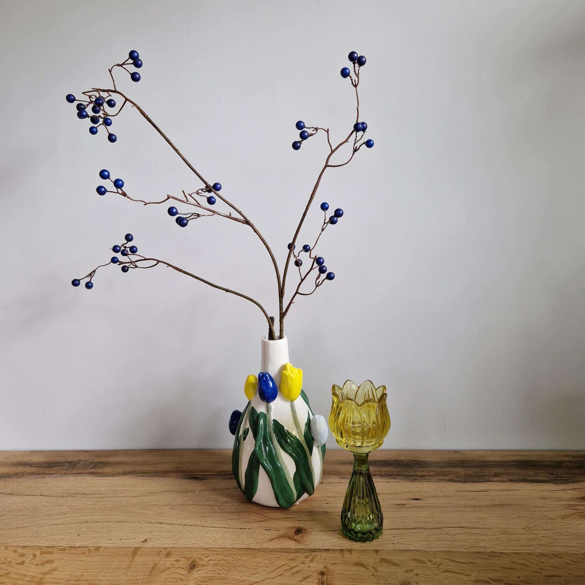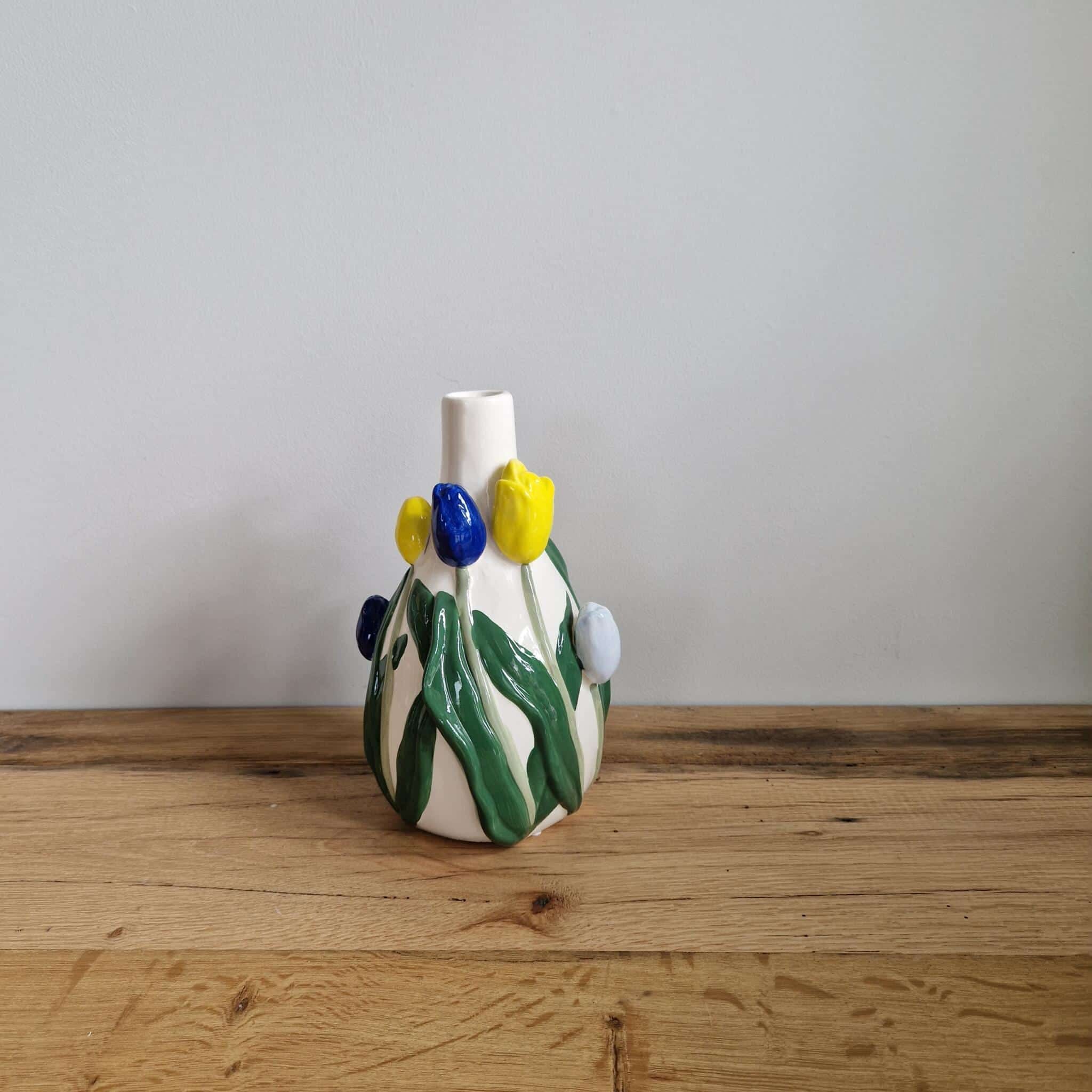 Breng de lente in huis met deze prachtige handgemaakte keramieken vaas van Daan Kromhout Design! De witte vaas is versierd met kleurrijke tulpen in reliëf, waardoor het een echte eyecatcher is in elk interieur. Perfect voor een frisse bos bloemen of als decoratief statement op zichzelf.