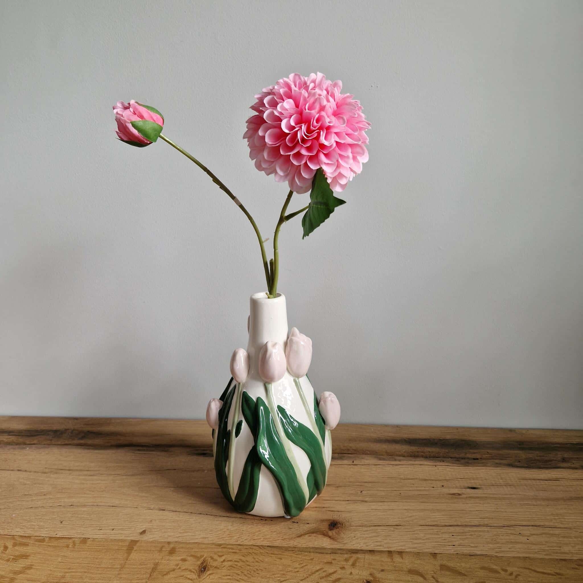 Breng de lente in huis met deze prachtige handgemaakte keramieken vaas van Daan Kromhout Design! De witte vaas is versierd met kleurrijke tulpen in reliëf, waardoor het een echte eyecatcher is in elk interieur. Perfect voor een frisse bos bloemen of als decoratief statement op zichzelf.