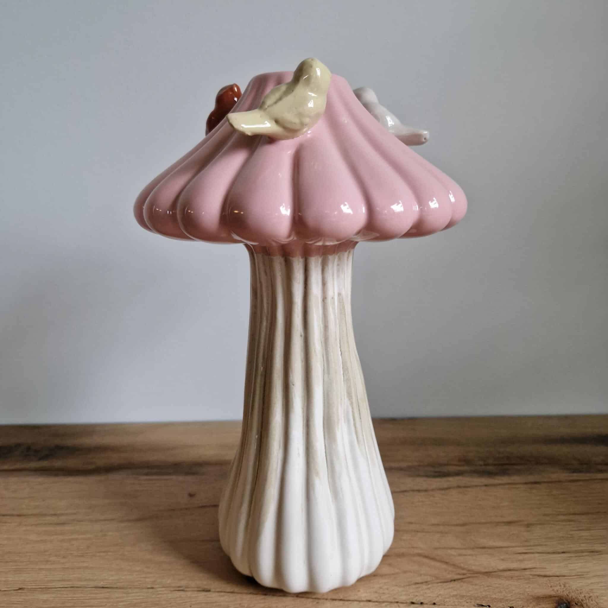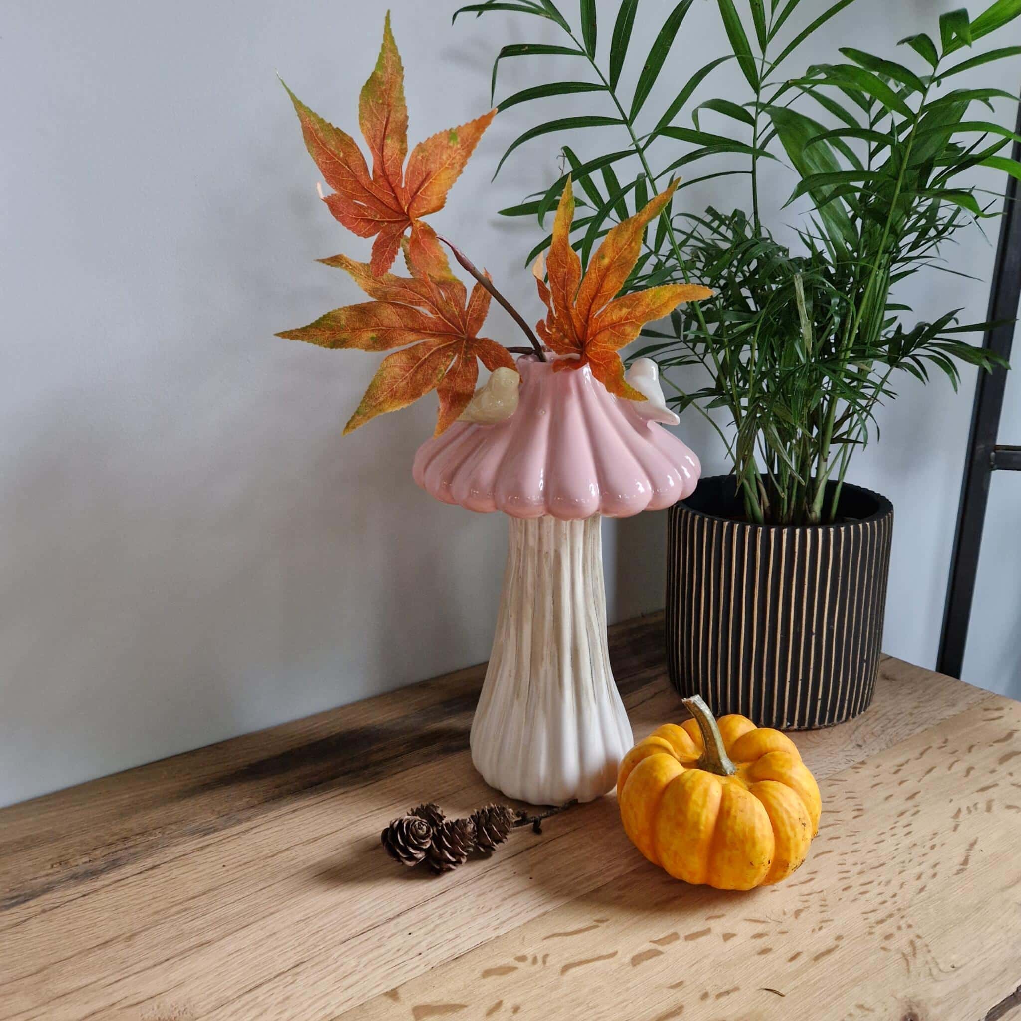 Breng warmte en stijl in je interieur met de prachtige Keramieken Paddenstoel Vaas van het trendy merk Daan Kromhout. Deze unieke vaas met vogeltjes is niet zomaar een vaas; het is een echte eyecatcher die je ruimte direct een gezellige, herfst/winterse sfeer geeft. Perfect als statement piece in je woonkamer, slaapkamer of keuken, en dankzij het charmante ontwerp met een paddenstoelvoet in beige, een roze hoed, en vogeltjes in crème, zachtgeel en terra, ook zonder bloemen een subtiele blikvanger.