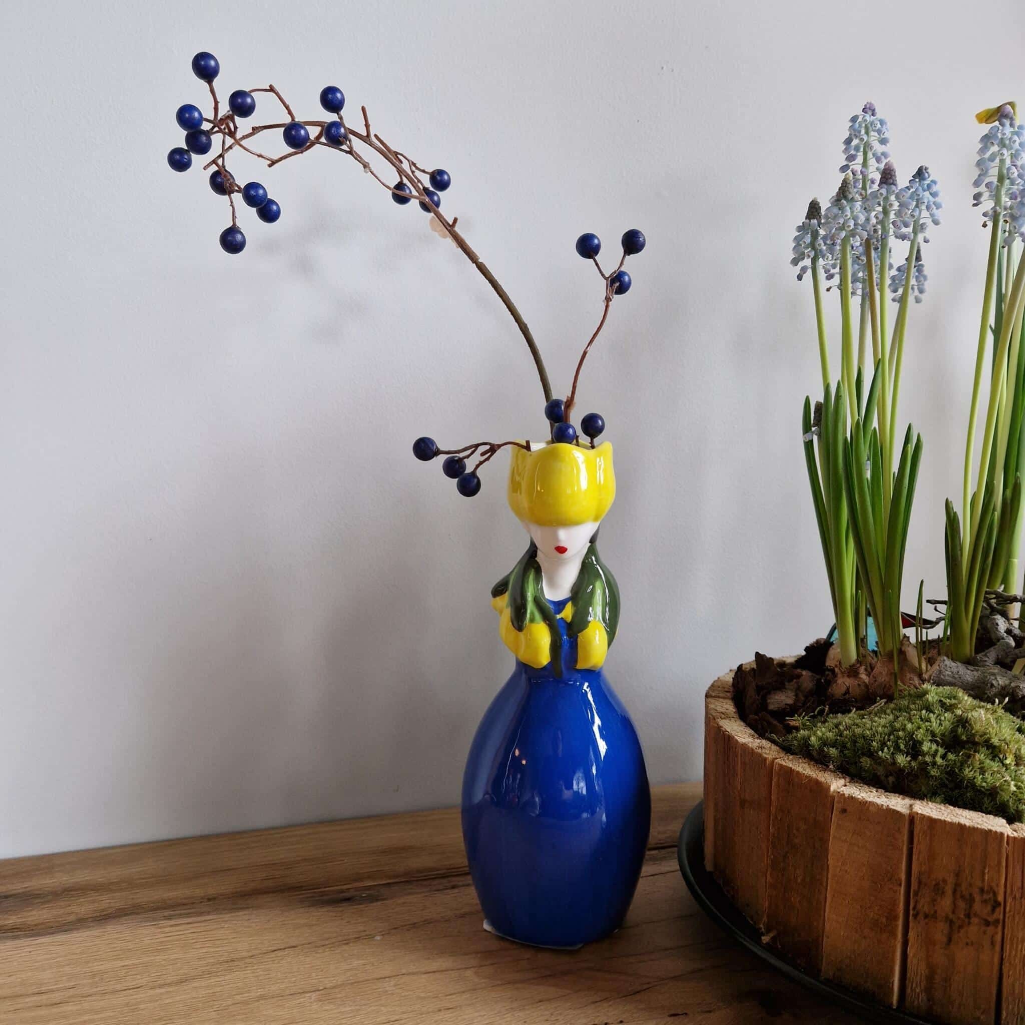Breng de lente in huis met de Lucy Dutch Woman vaasje van Daan Kromhout Design! Deze unieke handgemaakte keramieken vaasje combineert traditioneel Nederlands design met een moderne twist. De vaas heeft de vorm van een vrouw met een tulp als hoed en is uitgevoerd in levendige kleuren.