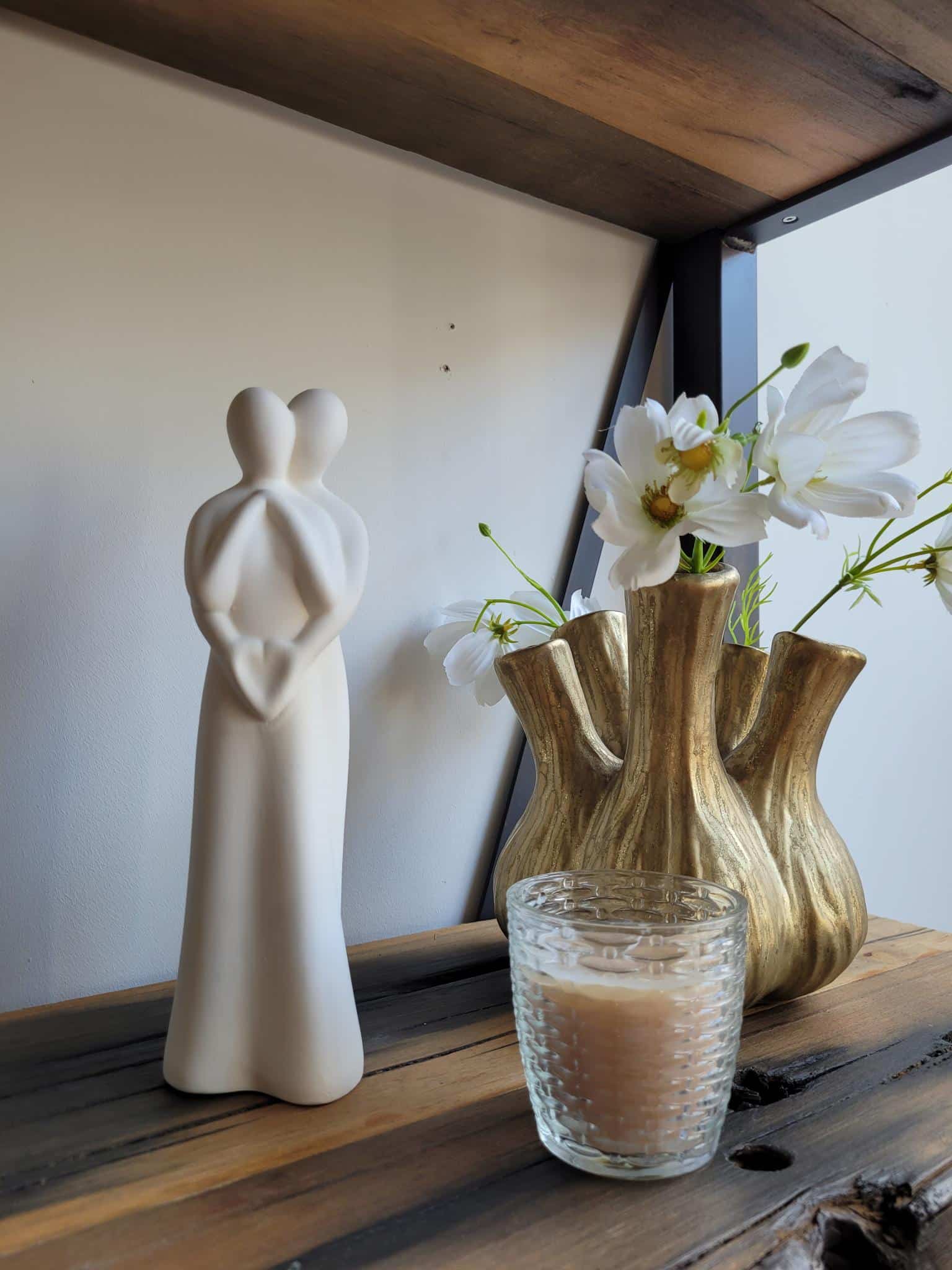 Gek op design en een origineel interieuritem? Dan is dit wit Keramieken beeldLiefdevolvan Gilde Handwerkecht iets voor jou. Een beeld van een een paar waarbij de persoon achter een hart met zijn/haar handen maakt op de buik van de vrouw.