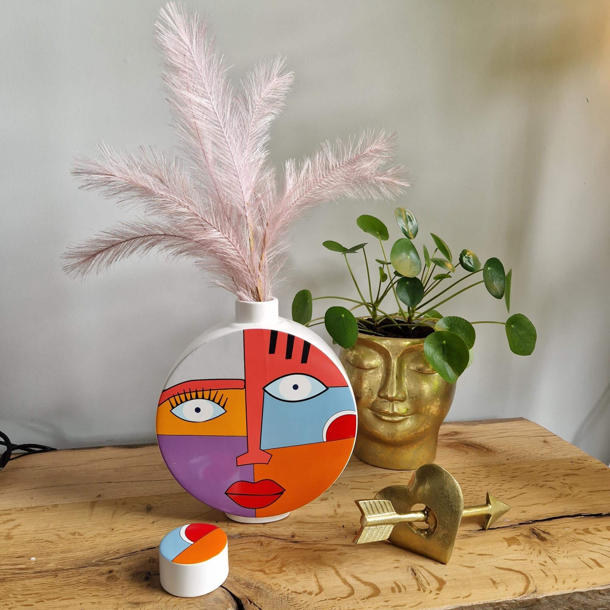 De vaas heeft een uniek Graphic Face motief in levendige multicolor tinten, wat het een echte blikvanger maakt in elke kamer.
