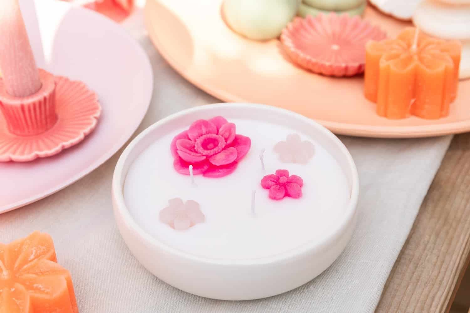 De kaars is gegoten in een witte schaal van keramiek en versierd met vrolijke bloemetjes in zachte roze tinten. Niet alleen mooi om te zien, maar ook perfect als sfeermaker op tafel, dressoir of in de badkamer.