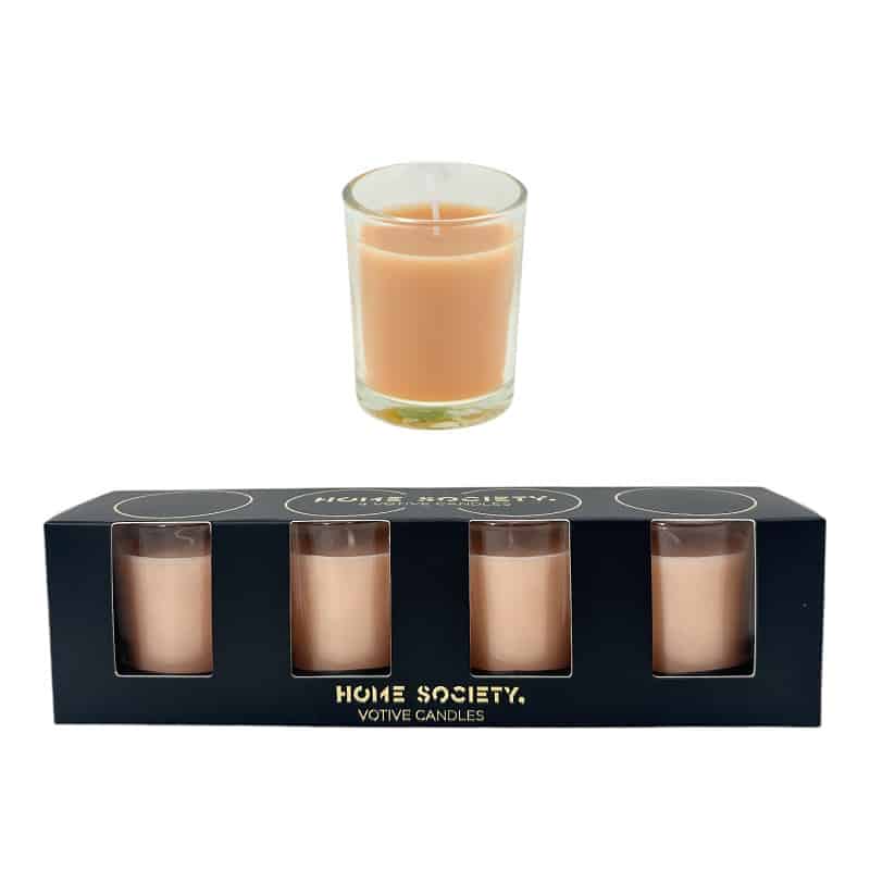 Het seizoen van de kaarsen is weer begonnen – maar eigenlijk is een kaarsje branden altijd een goed idee! Met deze set van 4 votive kaarsjes van het trendy merk Home Society geniet je van warmte en sfeer in huis. Elk glaasje heeft een brandduur van maar liefst 10 uur, waardoor je extra lang kunt genieten van het zachte, sfeervolle kaarslicht.