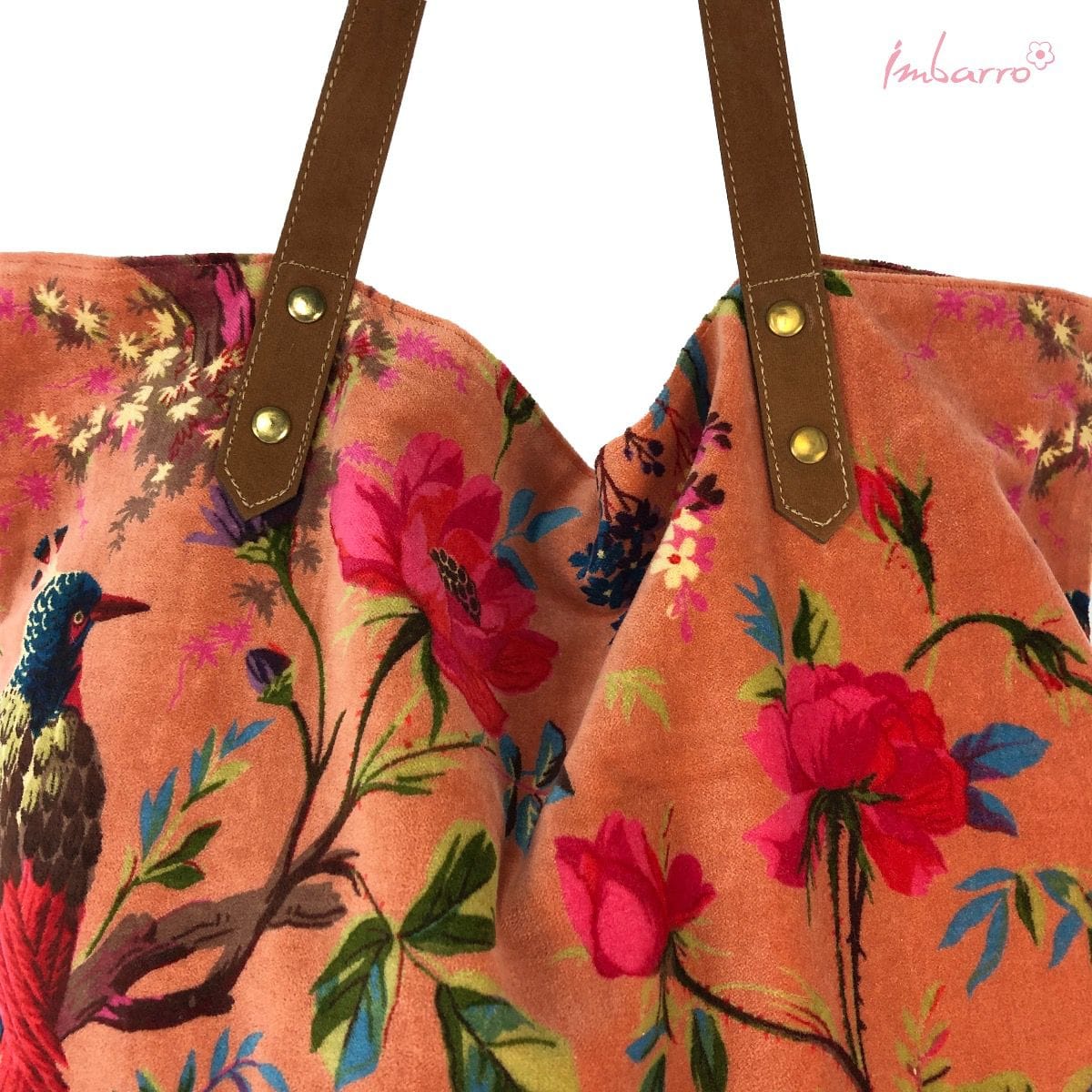 De Shopper Paradise Coral van Imbarro Home & Fashions een stoere shopper van velours in een prachtige licht oranje paradise print met bloemen en vogels. Een handige tas voor vele doeleinden. Als boodschappentas of bijvoorbeeld strandtas steel je de show.