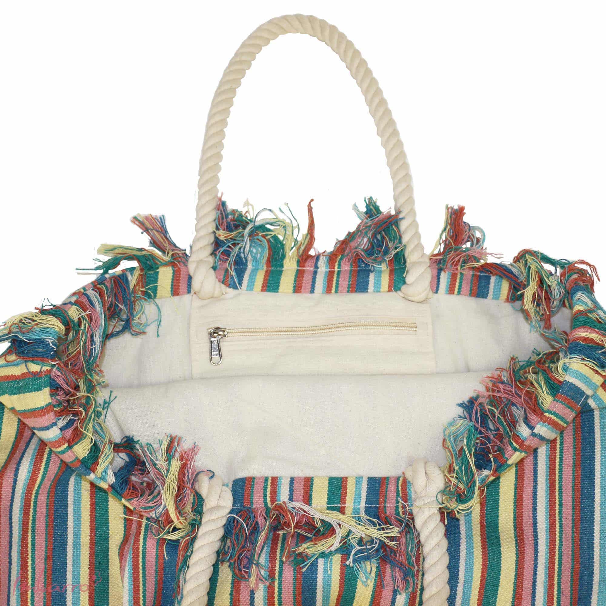 Trendy, kleurrijk, stoer en lekker vrolijk. De shopper uit de Marvelous Ibiza serie heeft een stoer gedraaid koord en vrolijke rafeltjes. Binnenin de tas zit een druksluiting en een vakje met rits. Een vlotte royale tas, daarmee ga je met plezier op pad. Mix de shopper met de passende pouch.